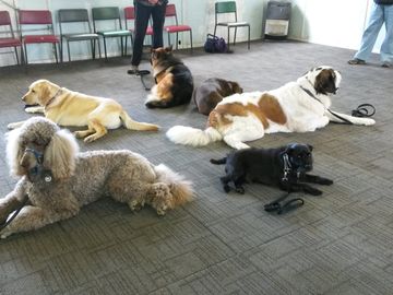 Fifteen dogs doing a two minute down stay out of sight of their owners